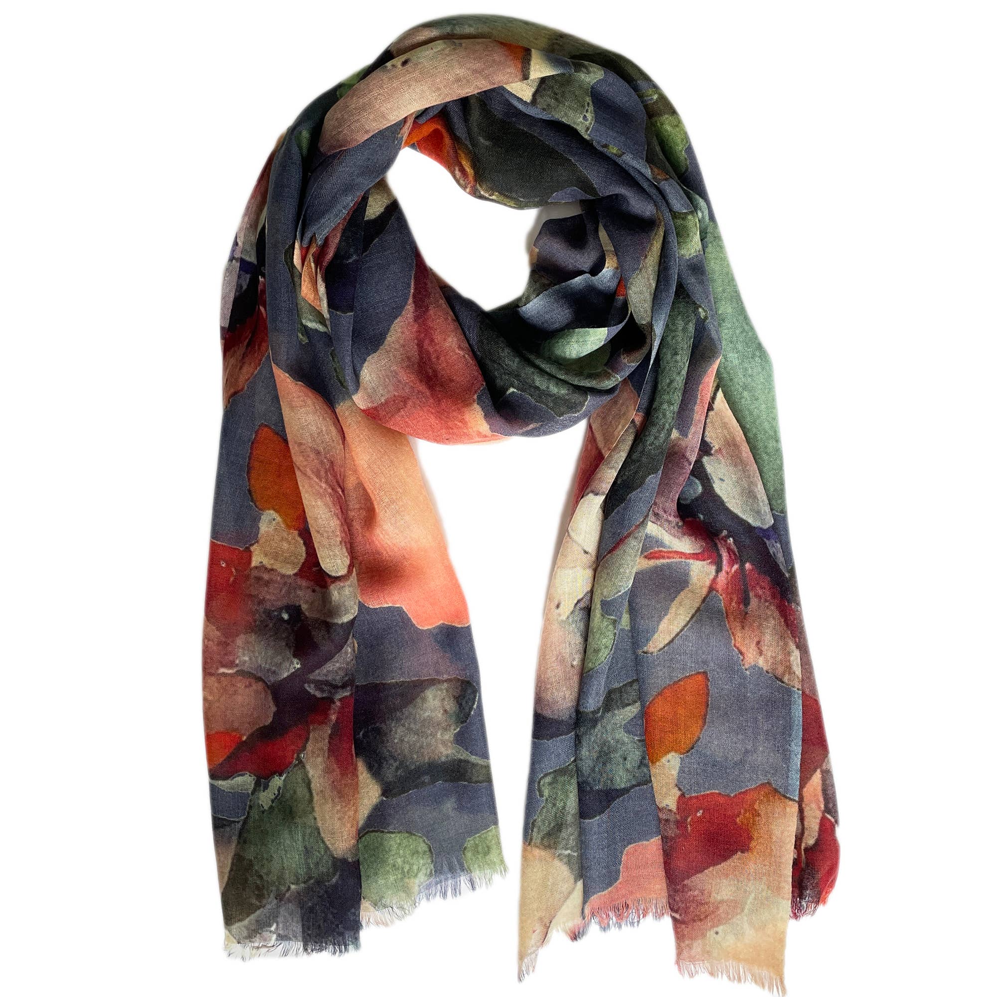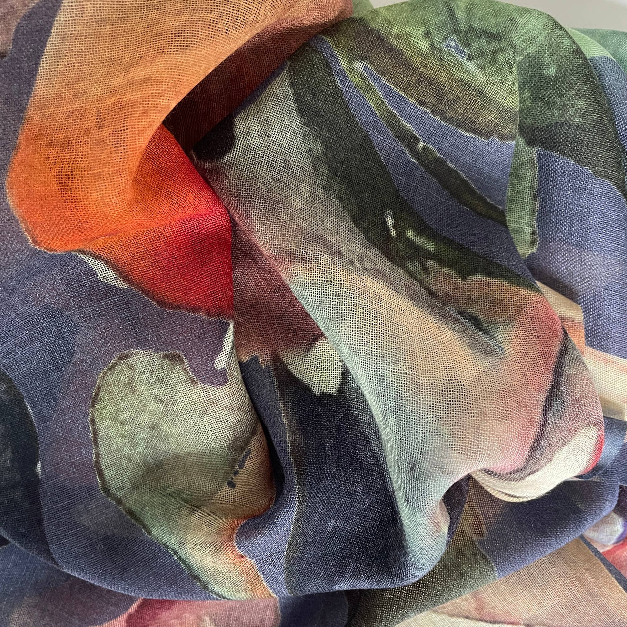 The Beatric scarf is part our digitally printed Maia Collection. Beatrice is printed on 90% Fine Wool/10% Silk. We love this fabric because it is comfortable to wear year round.
