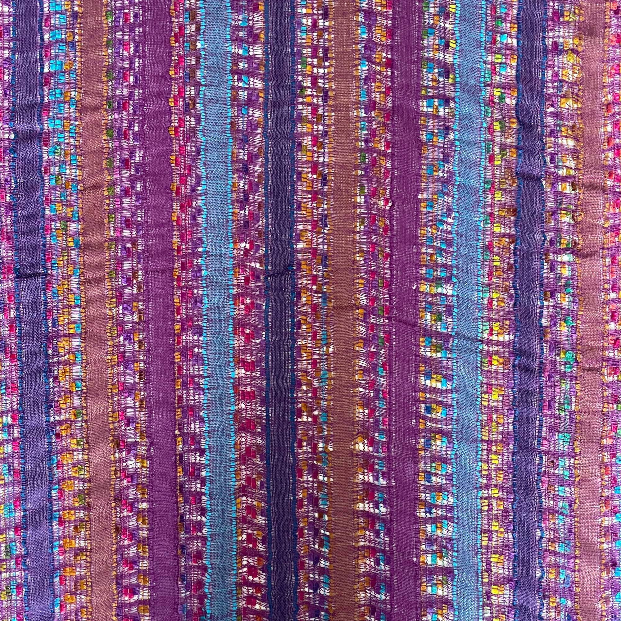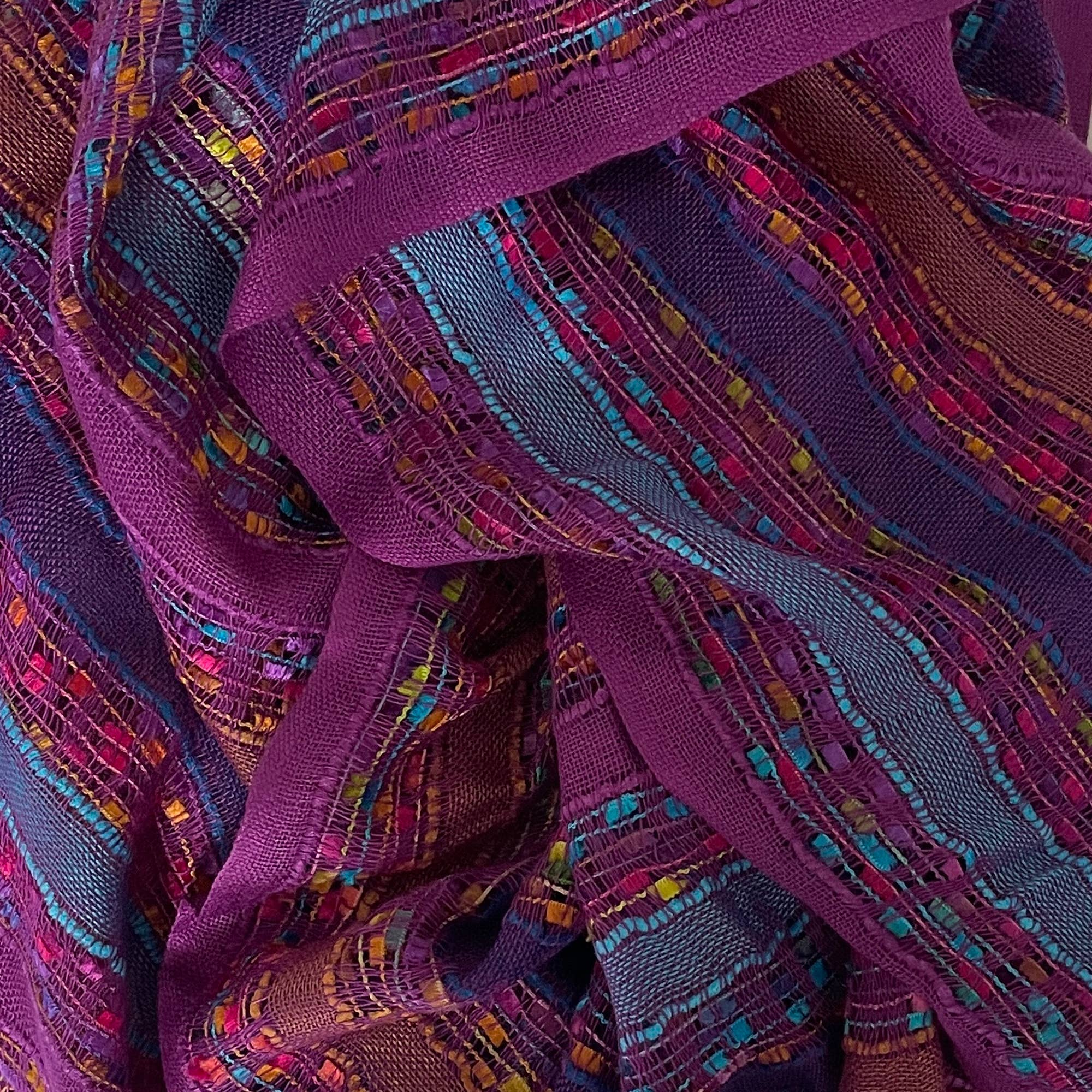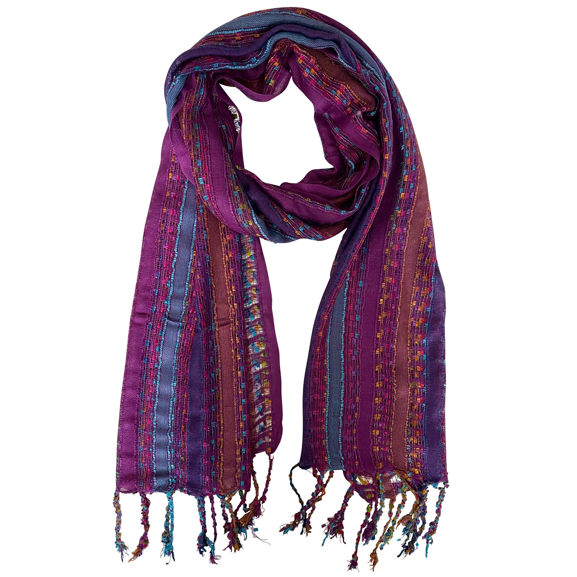 Fun multi color woven made from silky soft viscose. Finished with twisted fringe.