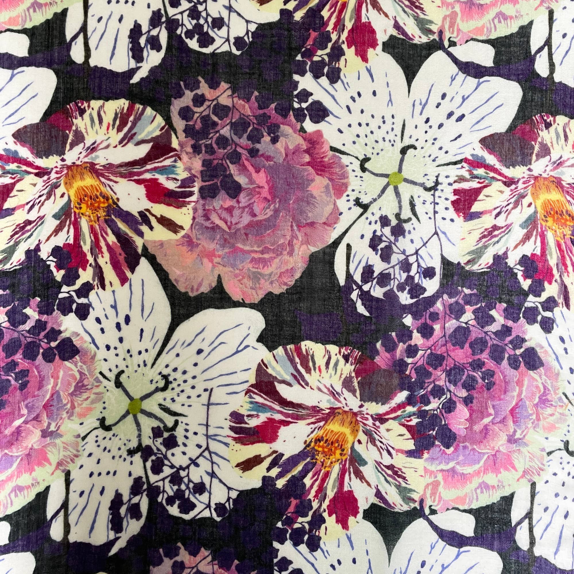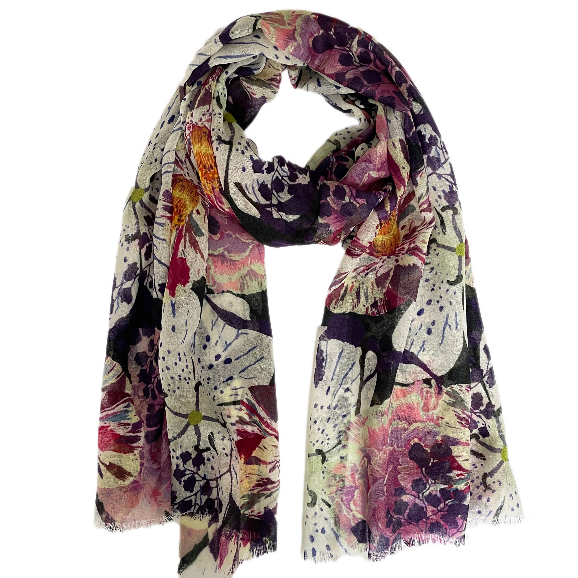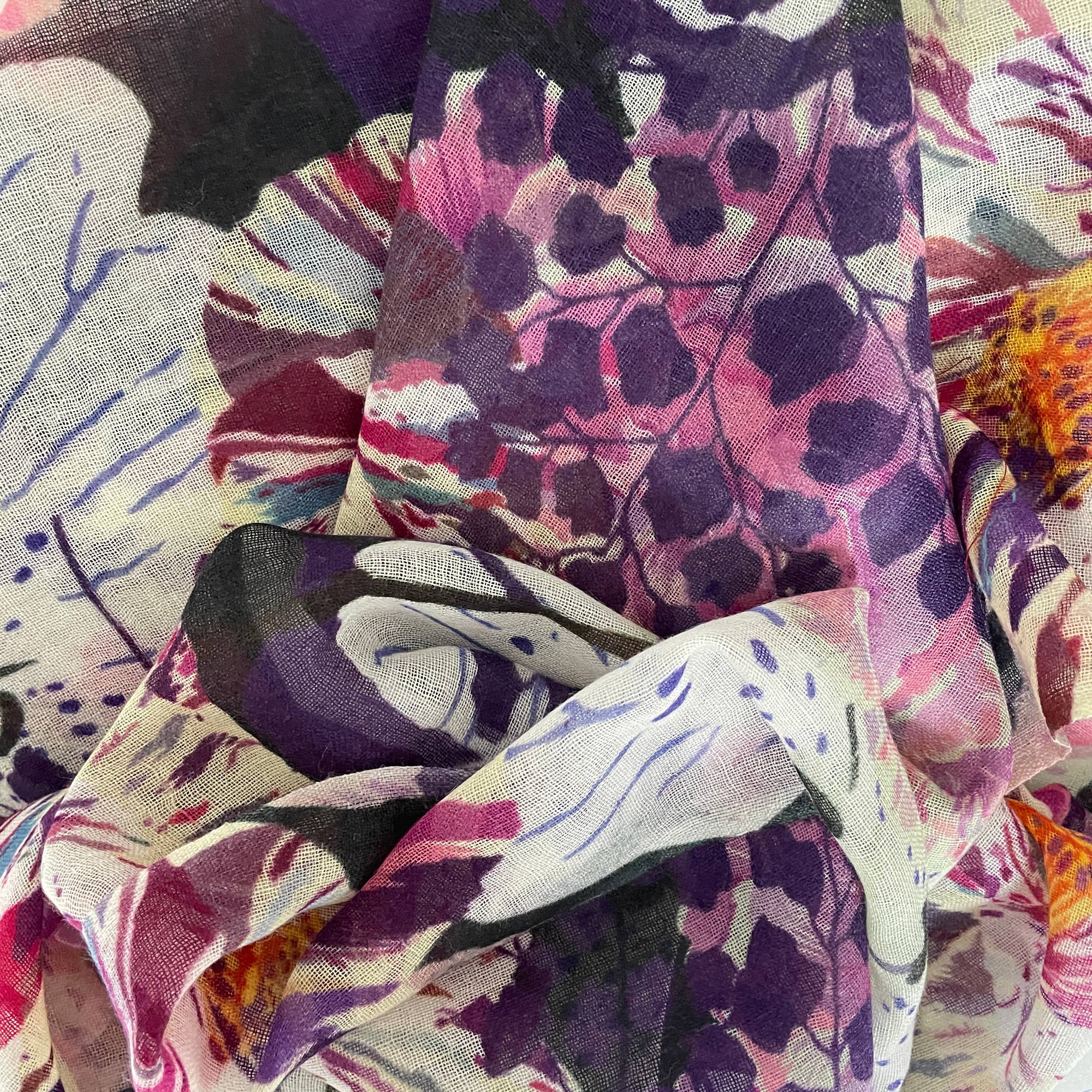 The Thea scarf is part our digitally printed Maia Collection. Thea is printed on 90% Fine Wool/10% Silk. We love this fabric because it is comfortable to wear year round.